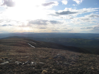 First, I was finally able to hit a summit in Alaska. There were little snow patches visible in the distance on the Wickersham Dome trail but none of it interfered with our travels this time. Two other friends from the hostel I'm staying at joined me on the trip. It doesn't take but half an hour to get a payoff from this hike. In half an hour you get to the lunch spot I posted on my previous attempt at this dome. After some typical hiking through spruce, the trail gets a little unique with a raised muddy portion that goes on for what I estimate is 200 meters. This portion is raised about 3 feet up and is about 1.5 feet wide. There were many wooden planks along the sides of the trail. Most likely they are going to add some boardwalk to this section. Although the hike is for Wickersham Dome it uses Summit Trail as the path in. Summit Trail does not actually reach the dome's summit though so once one gets close it is necessary to go off trail to reach the top. As usual, the high domes are marred with communications equipment. Most of the way up is comprised of muskeg but it was not too soggy. At the top the view was amazing. In the distance the highway and the pipeline are visible. An easy to moderate hike well worth the trip. It is my assumption that the moderate rating is due to the necessity to go off trail in order to reach the summit.